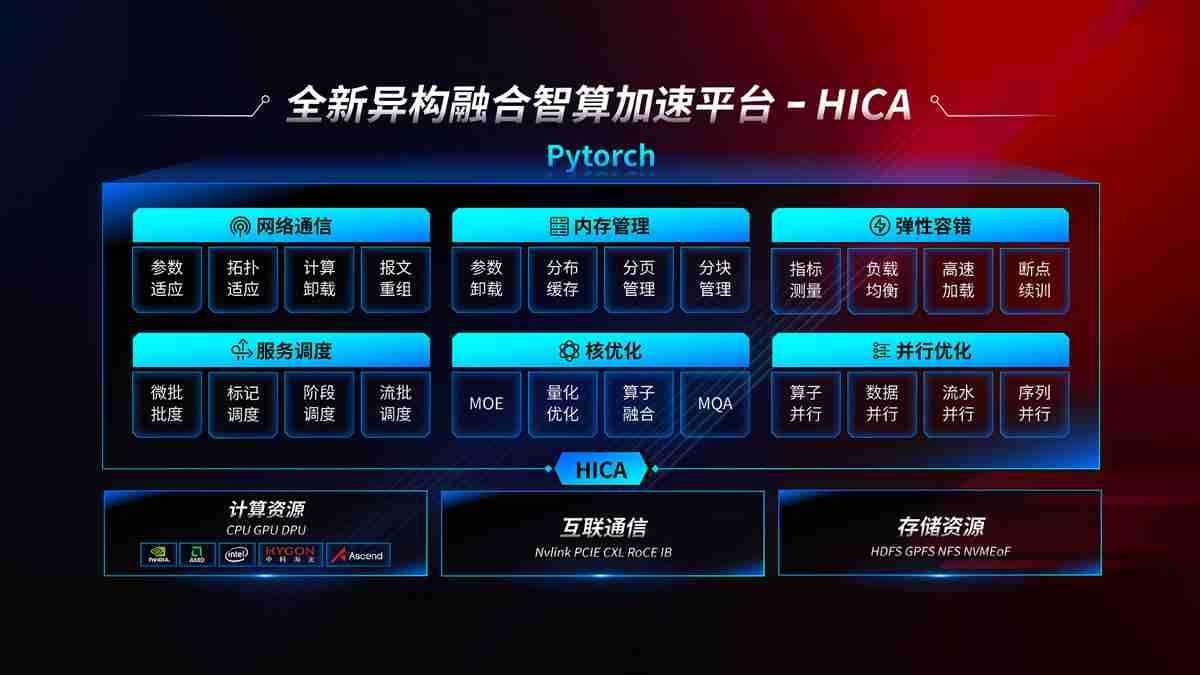 通过自研的服务层、、中间适配层、、、以及调度编排算法,,,采用数据并行、、、模型并行等多种并行方式,,,把并行计算任务进行有效的分解,,,,使其分别由相应的软件栈和算力资源来承接。。当GPU资源变化,,,,HICA可以实时动态调度计算子任务并调整模型拓扑和架构,,,,以充分聚合各种算力资源。。