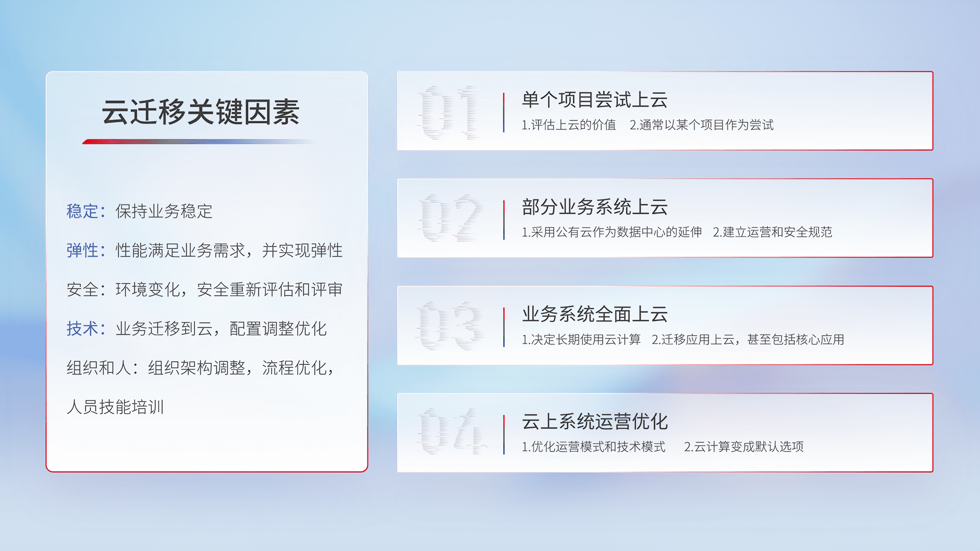 结合实际业务,,,从规划设计、、、云平台选型、、云原生改造、、数据迁移、、集成交付,,迁移全过程为客户识别最佳上云路径,,,做好风险识别管理,,,设计网络架构、、、、身份权限、、安全审计合规、、操作审计、、日志审计、、监控告警策略、、、、多站点容灾设计等,,,,对云上基础设施进行整体规划,,,,提升IT治理水平,,以满足弹性、、高可用、、高性能的需求。。
